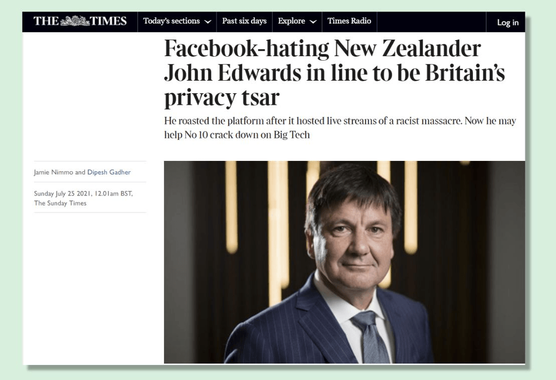 He deleted the tweets the next day, “because of the volume of toxic and misinformed traffic they promoted”, but the comments had already made headlines the world over. They were still making headlines more than two years later, when it emerged that Edwards was set to be appointed by Boris Johnson’s government as UK information commissioner. The Sunday Times broke the news in July with the words: “Facebook-hating New Zealander John Edwards in line to be Britain’s privacy tsar”.
