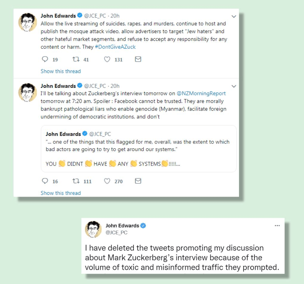 John Edwards deleted the tweets but he didn’t disown them. On the evening of Sunday, April 7, 2019, the New Zealand privacy commissioner watched a US network television interview with Mark Zuckerburg, in which the Facebook CEO and chairman broke a long silence on the Christchurch mosque massacre of three weeks earlier. The terrorist had livestreamed the mass murder on Facebook, but Zuckerberg was disinclined to make changes to the service. Edwards opened Twitter. “Facebook cannot be trusted,” he typed. “They are morally bankrupt pathological liars who enable genocide (Myanmar), facilitate foreign undermining of democratic institutions.”