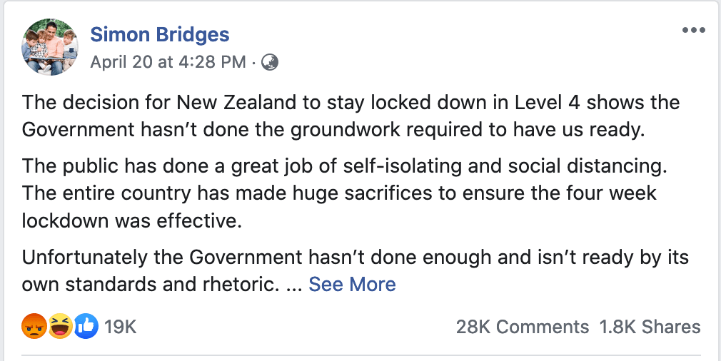 Simon Bridges’ Facebook post on the evening after the prime minister announced the timing of a shift from level four to level three received unprecedented engagement. At the time of writing it had levelled off around 28,000 comments, the vast majority critical, with around 15,000 negative emotion emojis to 3,000 positive. If nothing else, it put to rest long-running rumours that social media supremos Topham Guerin have been working for National in secret.