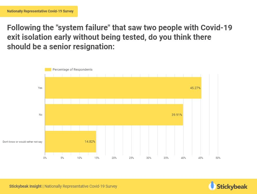 What of the “heads must roll” call? Some have demanded the resignation of the health minister, David Clark; a smaller number have suggested Bloomfield should go. We asked simply: should there be a senior resignation following the big revelation of last week? Just over 45% said yes, with 40% saying the opposite, and just shy of 15% noncommittal.