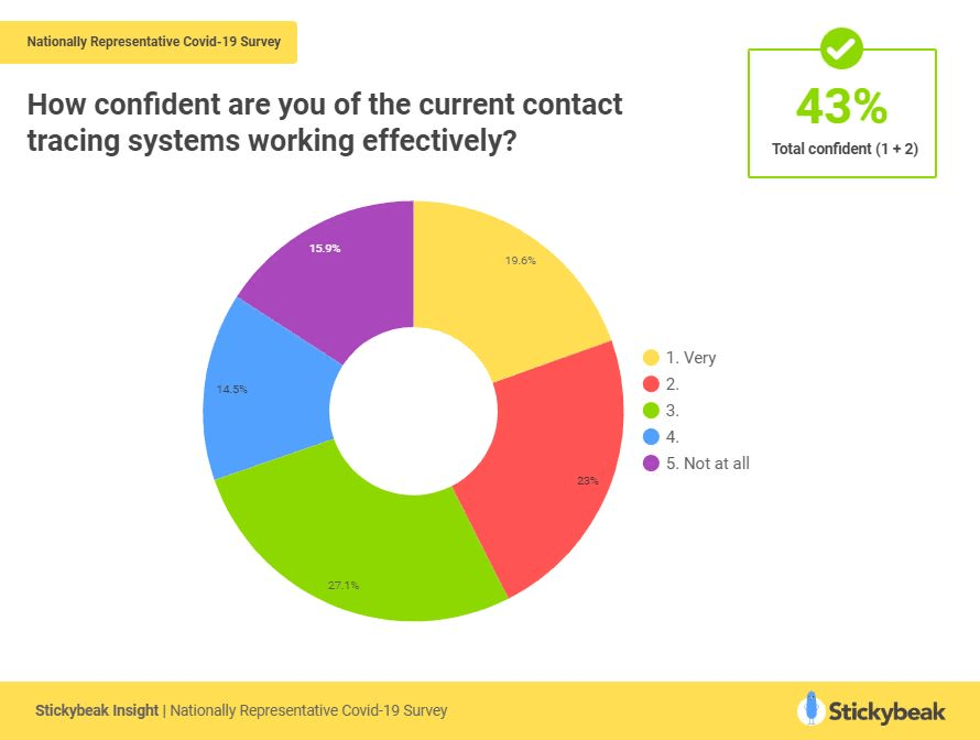 Confidence in the contact tracing system has taken an even greater hit than the overall assessment and the concern about a second wave; with the official system continuing to be sluggish in pickup and manual systems for visitors to premises all but abandoned, it’s down from 55% in our poll a week ago to 43%.