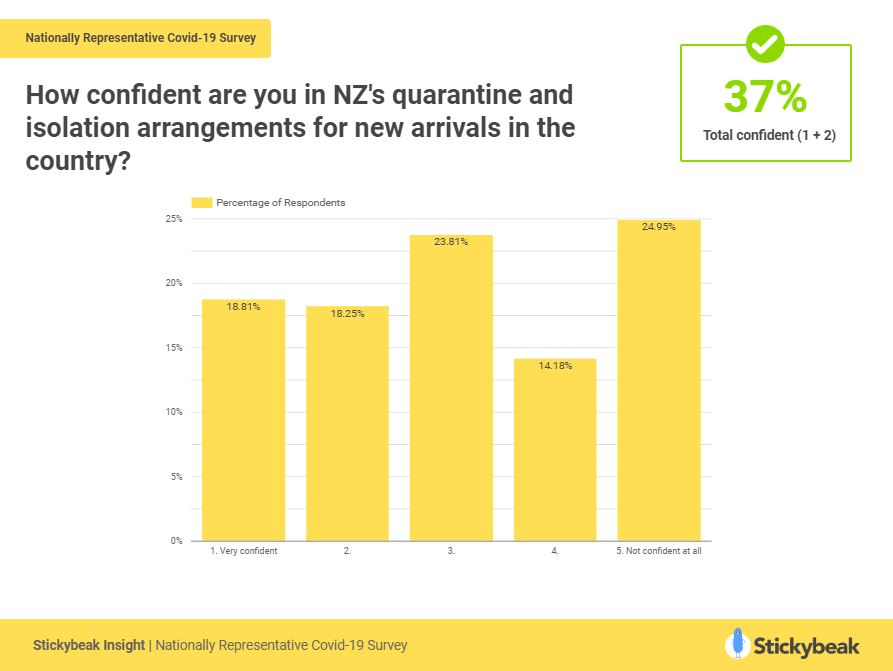 The Stickybeak poll, undertaken from Friday night through to yesterday morning, revealed the depth of feeling on the performance of the quarantine and isolation system. While 37% said they were confident in the arrangements, 39% said they were not, with 24% on the fence. Of the five options, “not confident at all” was the most popular, selected by one in four respondents.