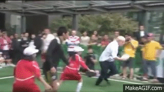 Whether innate or contrived or somewhere in between, his ability to bluster and extemporise has become an essential part of his character, and his charm. That has its physical manifestations, too: wobbling along on a bicycle, or falling into the Thames, or dangling hopelessly from a zip wire as London mayor in celebration of the Olympics, or bulldozing a 10-year-old in a touch-rugby match.