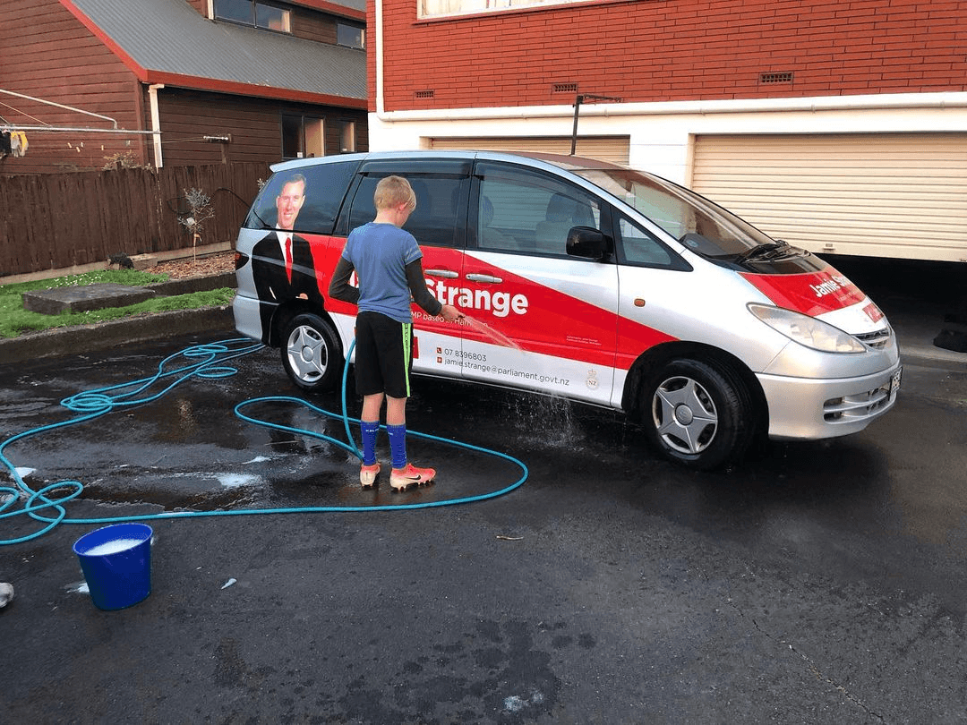 Strange apologises to his children for missing sports matches and thanks them “for putting up with an oversized photo of my face on our Toyota Estima for six years”.