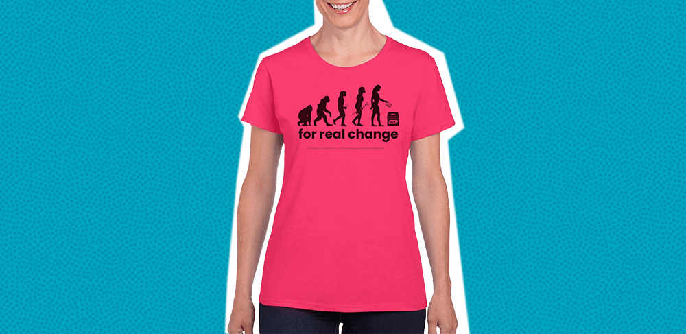 The designer of the graphic on this T-shirt – which is available in Act’s eye-hurting magenta – has left out a crucial pedestal. The ballot box, pictured on the floor, seems to be at an appropriate height for the chimp-like ape on the left of the image to reach. The evolved human on the right is going to hurt their back as they lean over to slot the envelope into the rather small slit.