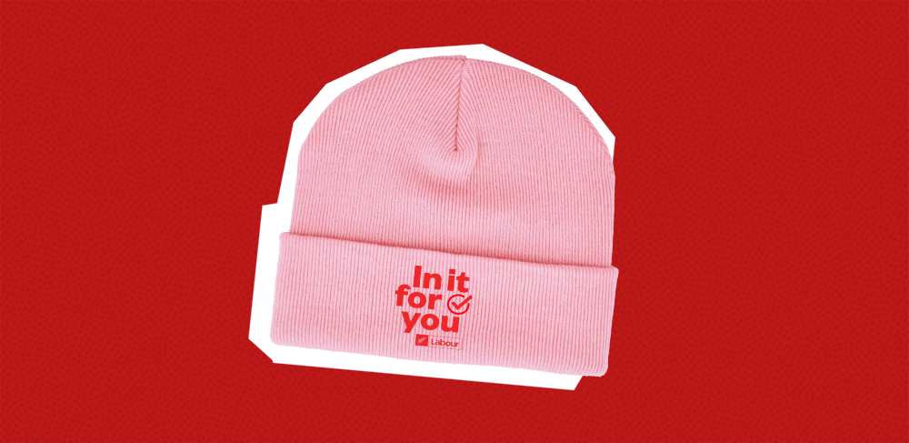 Labour’s beanie has nailed the millennial pink in the winter of Barbie, and somehow, in this colourway their slogan seems to take on the tune of the world cup anthem Do It Again by Benee. In terms of quality, I wouldn’t expect a lot. Zooming in on the image reveals the type has been plonked over the top of the photo in Photoshop – I assume IRL it will be cheaply embroidered. There’s no mention of wool content in the fabric, so it’s probably 100% acrylic.