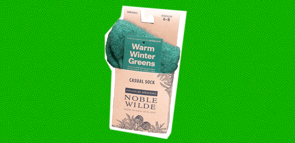 A third possum fur with a chunk of merino, silk and synthetic fibres (no doubt for stretch), these socks look lush and warm. Do they count as merch if there’s no Green logo, slogan, or branding in sight? Are they aiming for an insider’s if you know, you know approach? Did party members just want a discount on high quality New Zealand made knitwear that they can wear all the time? We may never know, and yet still covet these soft items.