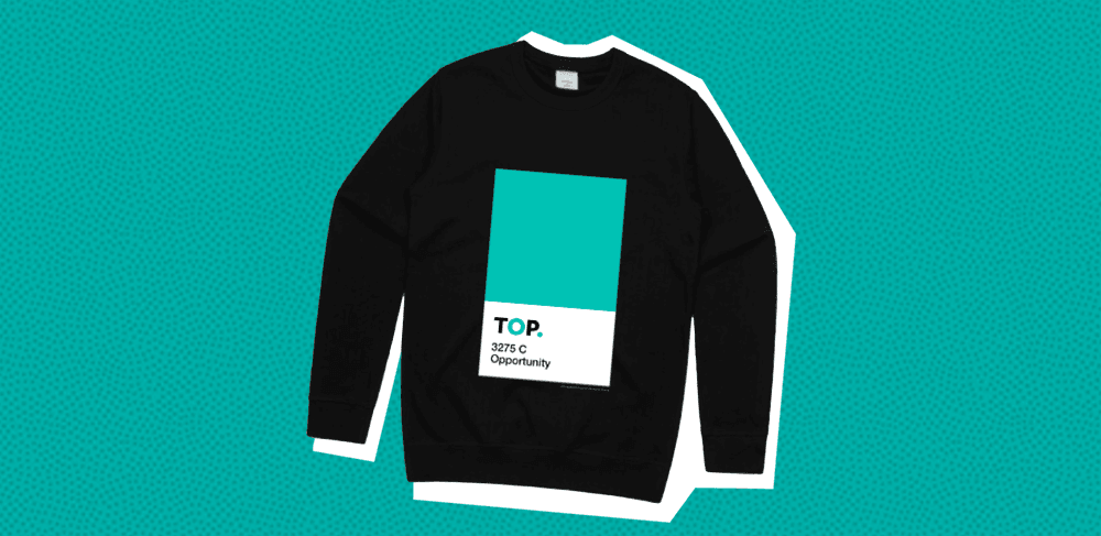 This TOP sweatshirt design is the perfect example of a graphic designer thinking graphic design is cool. It references a Pantone colour swatch, for no particular reason. Is TOP representing thoughts and views specifically of design-bros? Or do we just need to remind graphic designers that the rest of us don’t really care about colour swatches or typefaces?