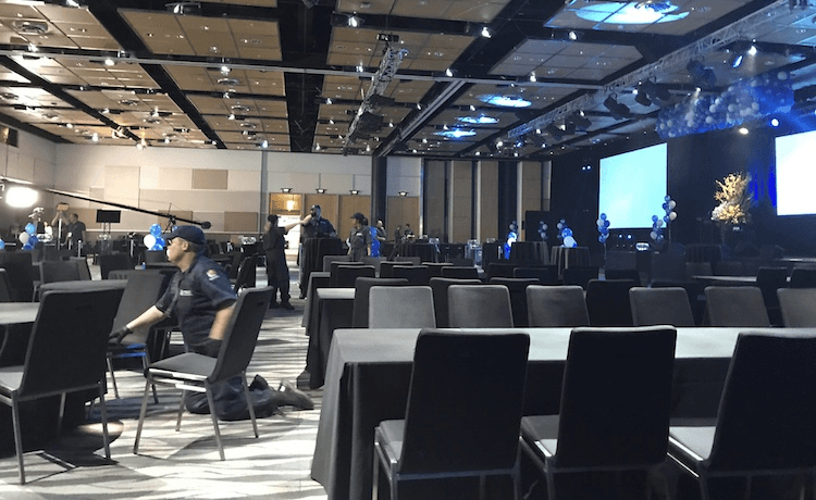 At the National Party room they’re busy filling glass bowls with blue and white streamers, while the cops look for bombs. “Looking for Labour Party members, actually,” said one of them.
