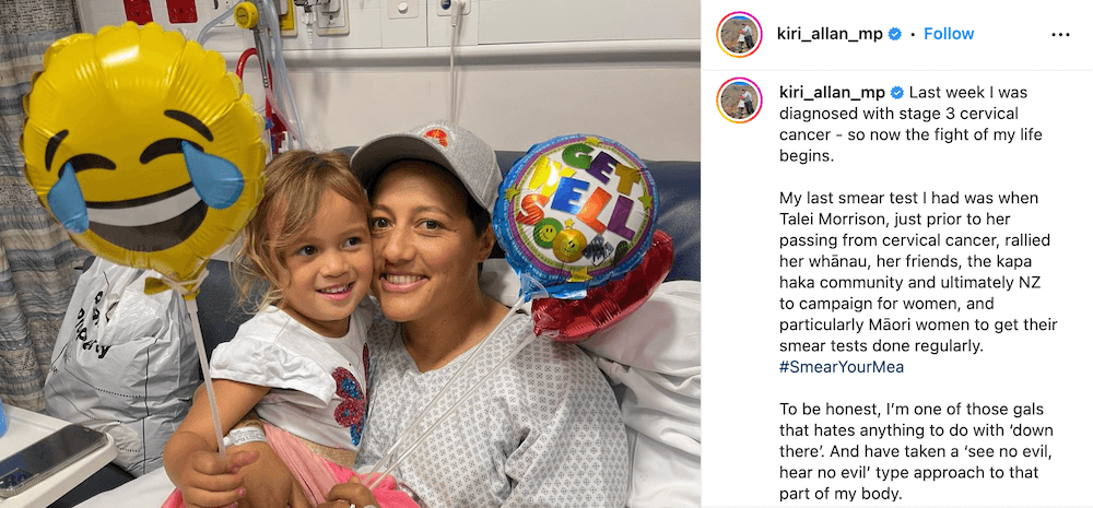 A couple of weeks later the results came back. The diagnosis was stage three cervical cancer, Allan announced in a social media post in which she urged women, Māori women especially, to get smear tests done regularly. “I was incredibly grateful to live somewhere with a public health system and I got to see it firsthand,” she said.