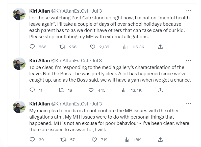 Allan was on mental health leave following a personal relationship breakup when Hipkins returned to New Zealand. She urged journalists and the public not to “conflate” her mental health issues with issues around her interactions with staff.