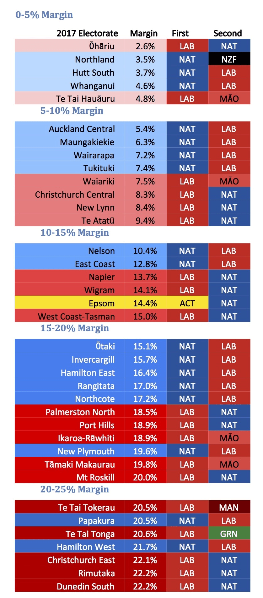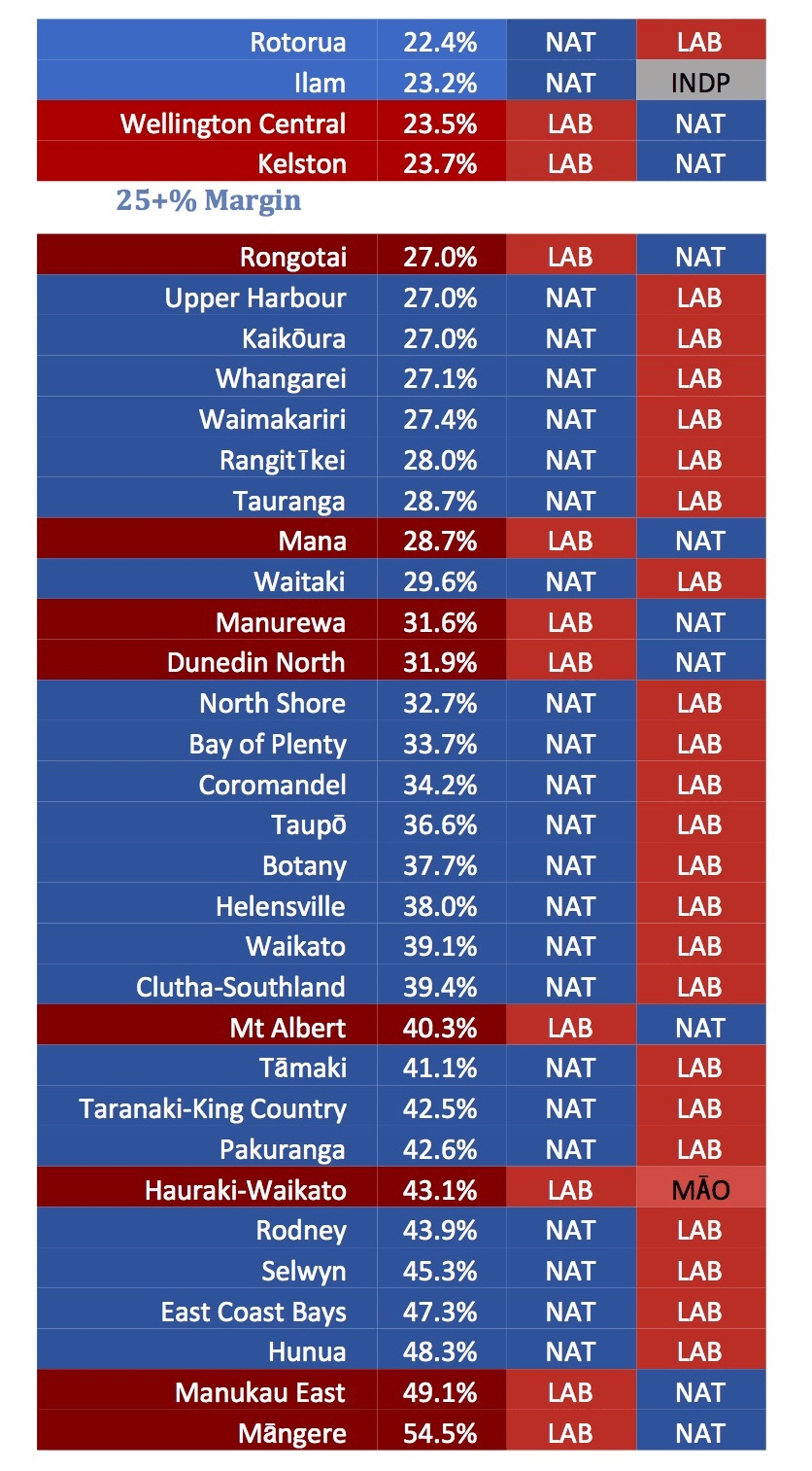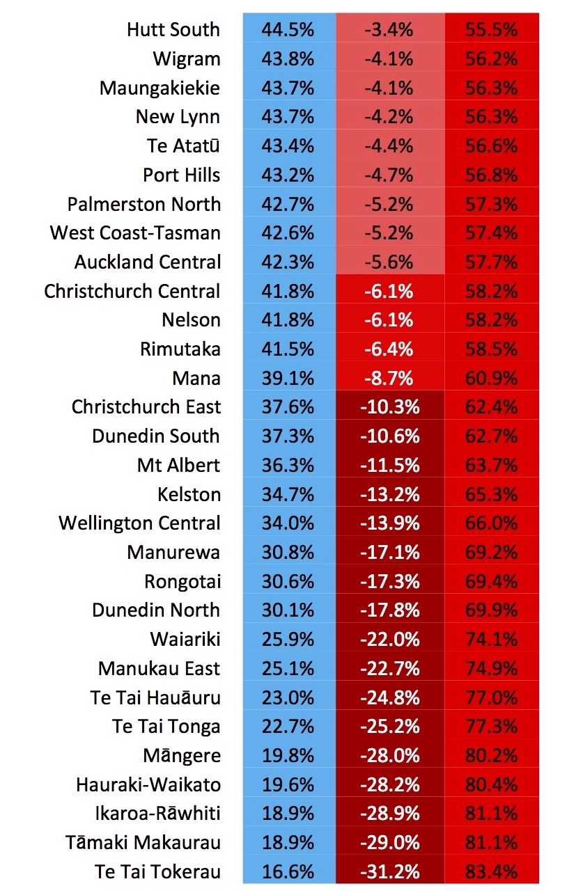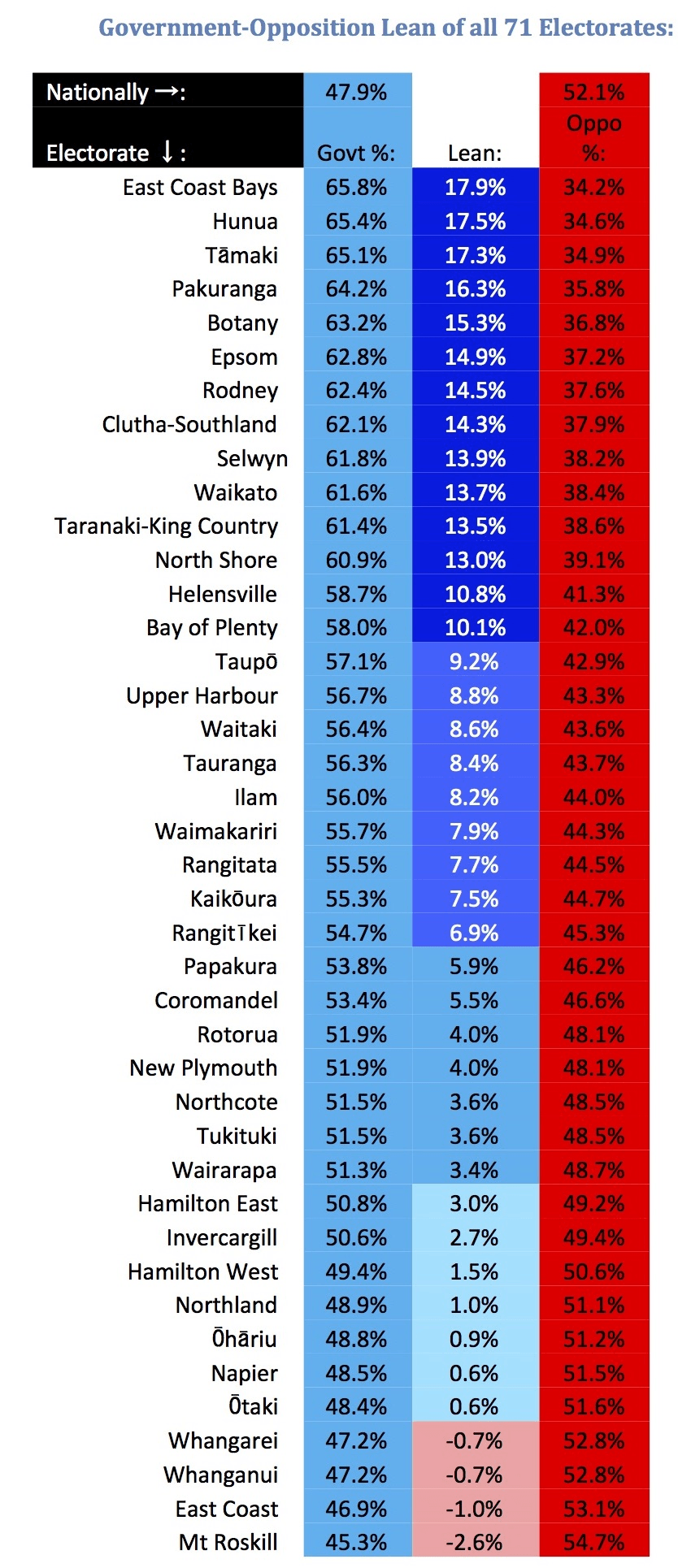 This reveals that, in 2017, 37 electorates leant more towards the government, whilst 34 leant more towards the Opposition. With a few exceptions; more urban areas and the Māori electorates lean more towards the Opposition, whilst rural areas more towards the Government.