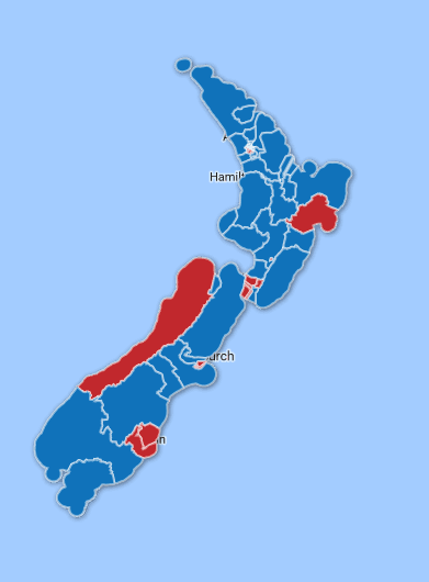 If you watched the results on election night, you may have seen the map of New Zealand’s electorates. Despite the overall party vote, showing a relatively close result (with New Zealand First holding the balance of power), one would be forgiven for thinking a National landslide had occurred based on the amount of blue covering the map of the electorates. For example, TVNZ displayed the following map as part of its coverage: