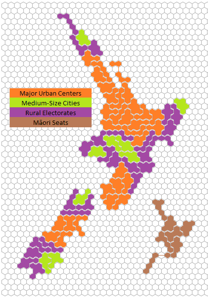 The Electorate Hexamap retains the general shape of the country, and places each electorate as well as possible to remain in as similar position relative to its neighbours. However, it does render some electorates trickier to identify once they have variously expanded or contracted. For example, Auckland has such a large population, it extends as far as where Lake Taupo would otherwise be; similarly West-Cost Tasman shrinks to the North-Western most corner of the South Island. The flipside of this is that we get a much better sense of proportion.