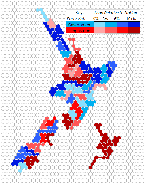 However, showing the candidate results carries the unavoidable consequence of presenting a distorted picture as it does not account for the full distribution of political support. So the more striking use of the hexamap is the ability to more clearly visualize the distribution of support for the Government and Opposition parties.