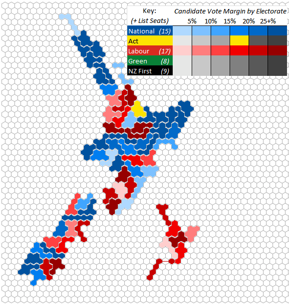 The first and most obvious way to use the hexamap is to show the winners of the candidate vote in each electorate. Much like in the pre-MMP era, the dominance of the two largest parties is striking. And even when minor parties secure an electorate seat, they struggle to achieve winning margins on par with most major-party candidates.