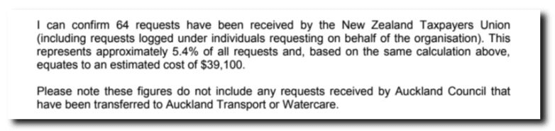 In response to our request, lodged last year, the Auckland Council told the Spinoff that, in the year to 30 June 2017, “64 requests [were] received by the New Zealand Taxpayers Union (including requests logged under individuals requesting on behalf of the organisation). This represents approximately 5.4% of all requests and, based on … the estimate of the cost to council of $611 per request … equates to an estimated cost of $39,100. Please note these figures do not include any requests received by Auckland Council that have been transferred to Auckland Transport or Watercare.”