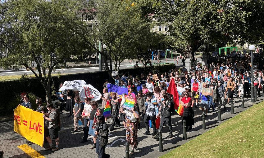 Also on Sunday, an hour earlier and some 431km away, hundreds of those who Peters would likely deem most guilty of “woke social engineering” took a hīkoi through Wellington’s city streets to parliament to call for fairer access to puberty blockers.