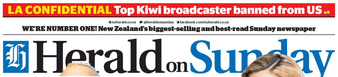 It’s there above the masthead of this morning’s Herald on Sunday. Top Kiwi broadcaster Barry Soper has been told he can’t board a plane to the United States because he hasn’t got his ESTA, which is very much like the James Ellroy novel-turned-popular-motion-picture LA Confidential about sex, organised crime and murder in 1950s Los Angeles.