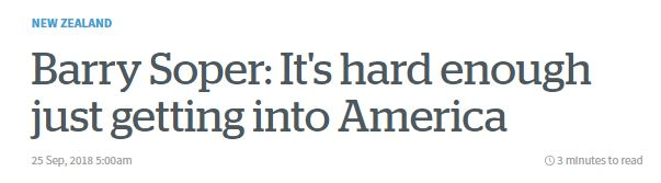 While we await further developments, was this the column that led to top Kiwi broadcaster Soper being refused egress into the land of opportunity? Not the bit when he urged Jacinda Ardern to “drop her guard” and be more open like John Key was when he talked about peeing in the shower and having had a vasectomy, but when he called President Trump “doolally”?