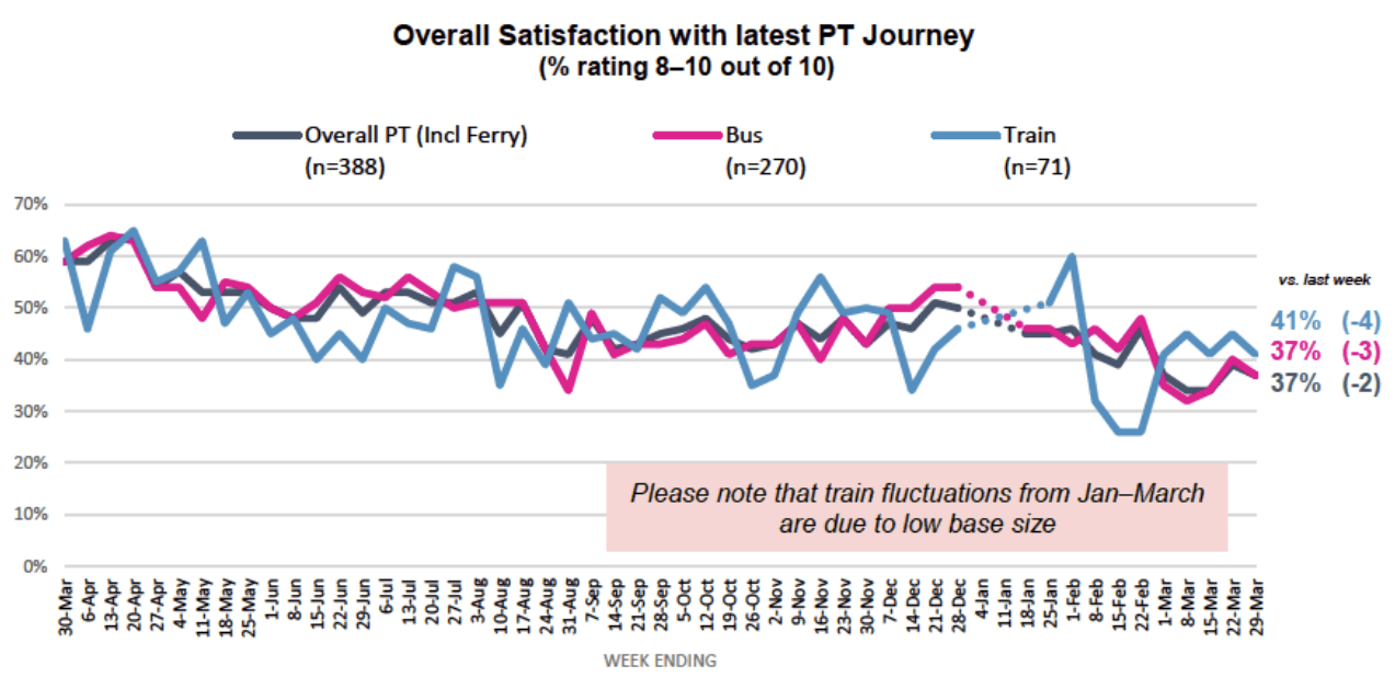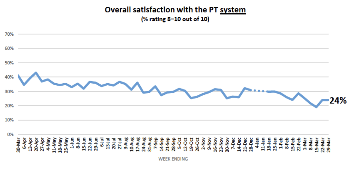 There were some encouraging signs, albeit from a low base, by the end of March. In the week ending March 29, overall satisfaction with the latest journey was 37%, with overall satisfaction with the system at 24%. By the end of the month, train satisfaction was at 43%. Patronage across the system increased in March.