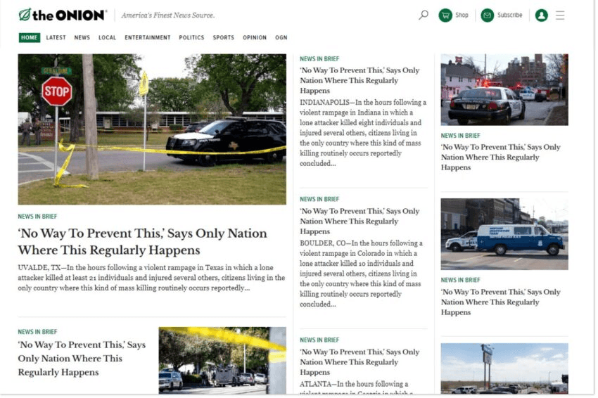 In the United States, meanwhile, the satirical site The Onion summed up the bleak scene by adding yet another episode to its visceral, years-long series of headlines: ‘No Way To Prevent This,’ Says Only Nation Where This Regularly Happens.
