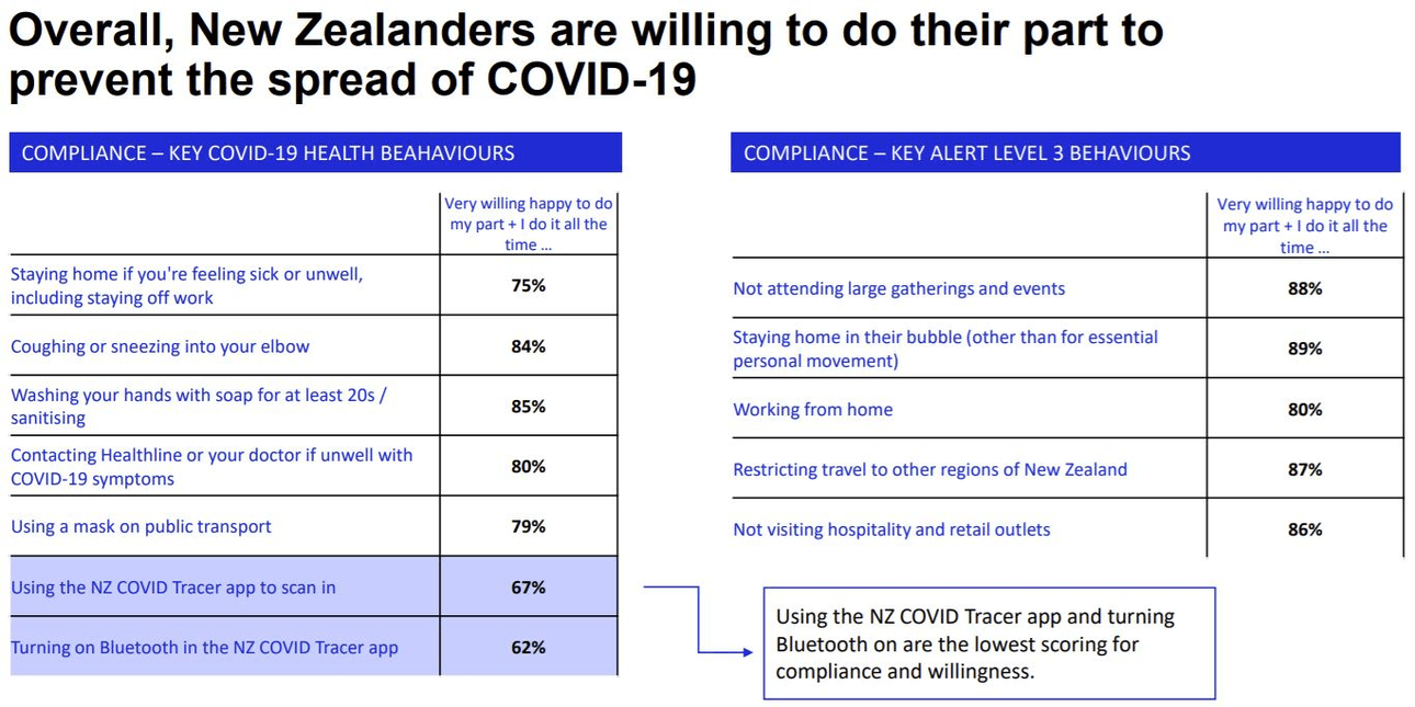 The challenges around use of the Covid app are underscored by findings in recent research by TRA for the Department of the Prime Minister and Cabinet. Of a range of factors surveyed, it found "using the NZ Covid Tracer app and turning Bluetooth on are the lowest scoring for compliance and willingness".