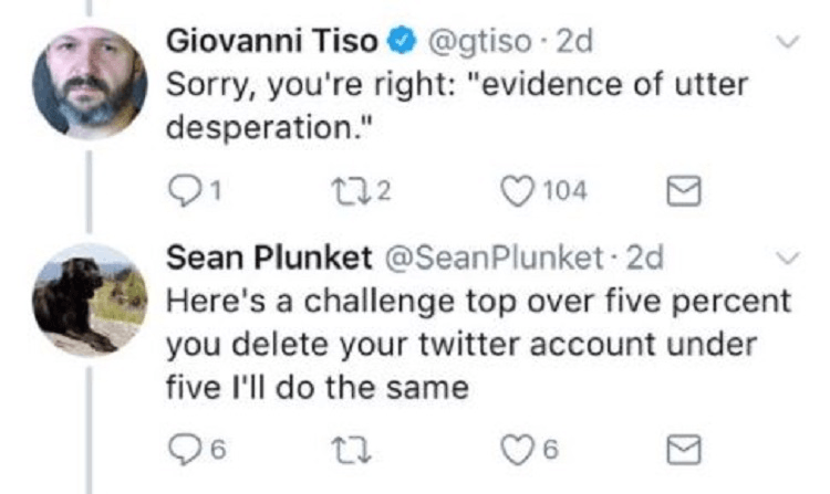 Plunket eventually offered to delete his Twitter account if TOP didn’t get 5%.