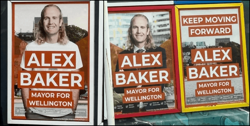 Here, Alex Baker is pictured appealing to the two types of Wellingtonians: the bureaucrats/public servants, and everyone else (not pictured in the white tee poster: a pair of Dr Martens on the feet). In another frame, he lets the streets of Wellington do the talking. A man of the people indeed. / LWS
