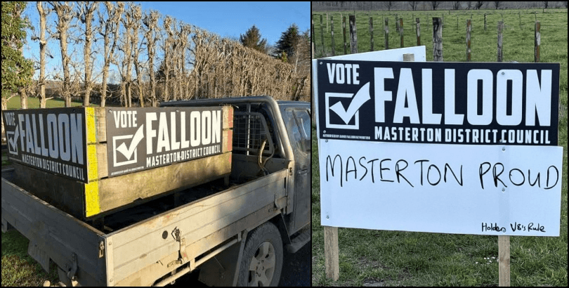 Simple and effective, and the handwritten addendum is a classy touch. Did Falloon add it himself? Did a supporter? Did a rival who knows Falloon actually loves Fords and is trolling him? Is that ute on the left a Holden V8 or is it in fact a Ford? Maybe it’s a Hilux? Maybe ChatGPT is right and it’s a goddam Isuzu? Do the people of Masterton know? Please get in touch.