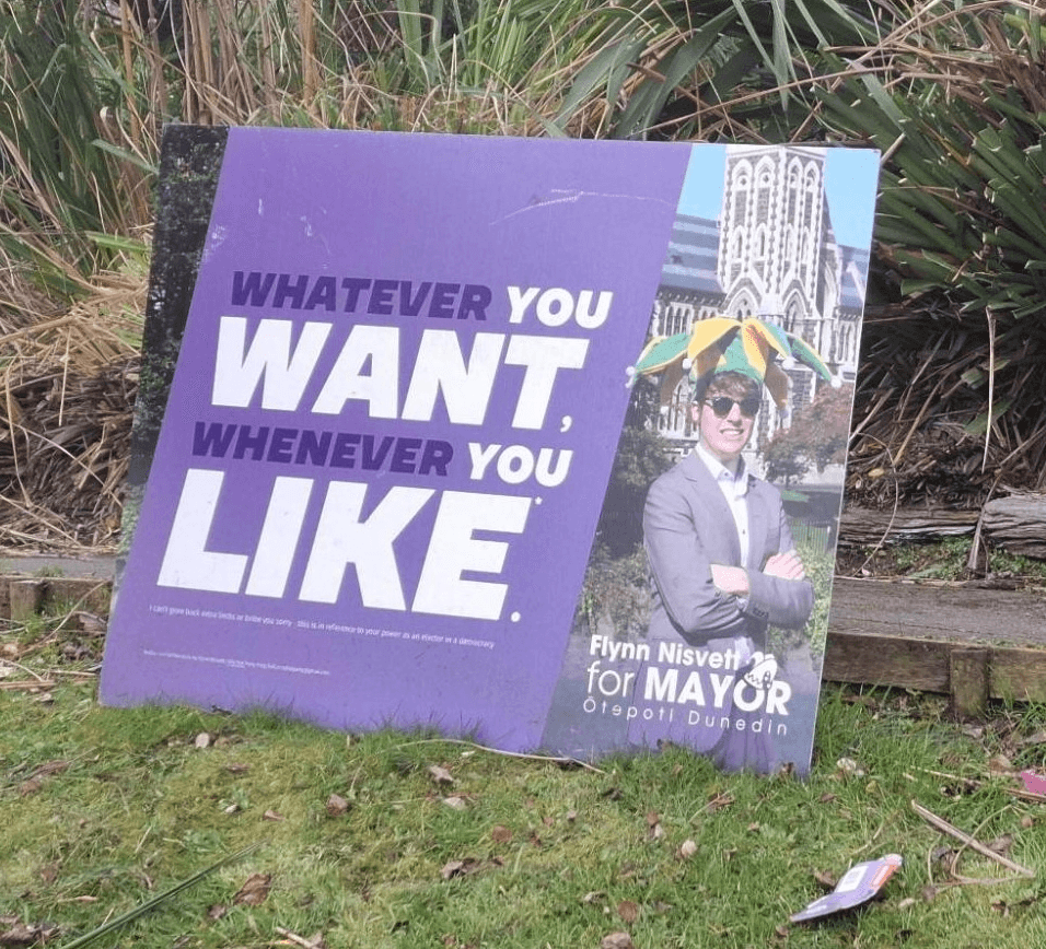 There’s nothing more heartwarming than a hand-painted election sign, and I can only applaud the brave visionary who had the arduous task of cutting out the tricky flame shapes on sign number two. Plus, does voting for Lachlan mean that Dunedin will actually get a summer this year? Now that’s a campaign winner. / Tara Ward