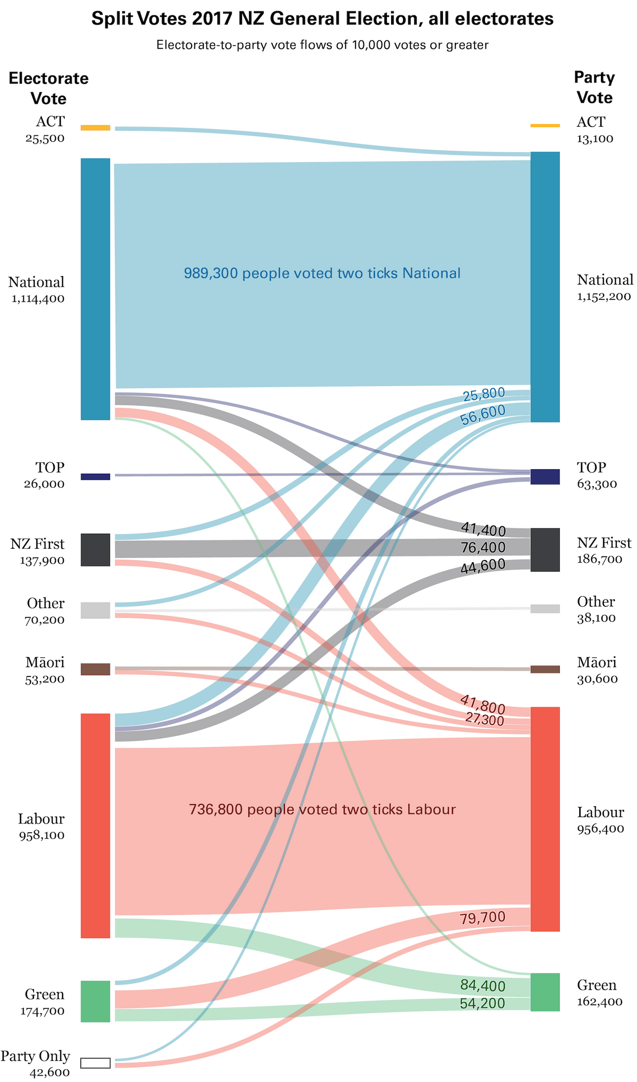 Bars on the left represent how many votes each party received for their electoral candidates (e.g. 137,900 people voted for their local NZ First candidate with their electoral vote). Bars on the right represent how many party votes each party received (e.g. 186,700 people voted NZ First with their party vote). The curved lines connecting the bars show the degree to which people split their votes (e.g. 76,400 people gave two ticks to NZ First, while 44,600 people voted for a Labour candidate with their electoral vote but NZ First with their party vote).