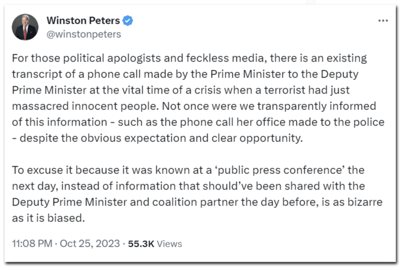 With characteristic stupidity, Peters’ critics, namely the political apologists and feckless media, had misinterpreted his tweet. When he said that “we waited until today to find out, for the first time [etc],” what he meant was that Ardern had not told him this piece of information on the telephone the day before that press conference.