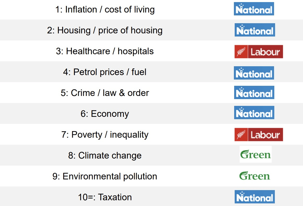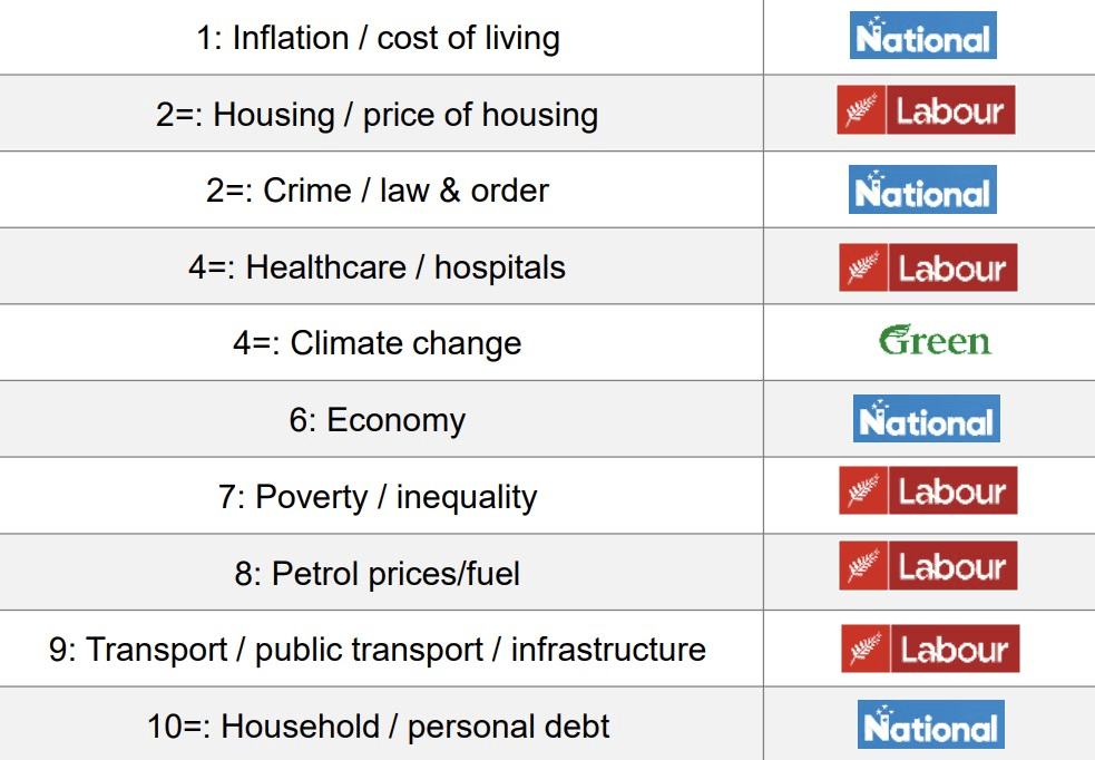 One year later, that board looked very different. Inflation and cost of living had leapt to the top of the list of concerns, and National was judged best to deal with it. But it wasn’t just that. Across six of the 10 issues judged most important (and five of the top six), National was considered the best equipped to respond. Labour was left with just two spots, as was the Green Party. In sum, it told you why National was winning.