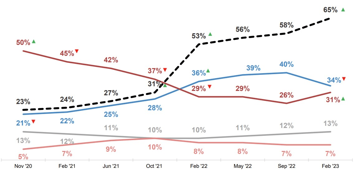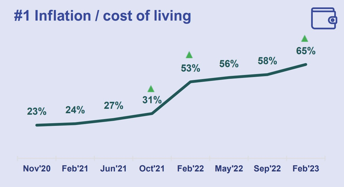 There is no sign, however, that inflation and the cost of living are receding from the foreground in election year. On the contrary: the issue is identified by all but two out of three respondents as one of the three biggest issues, almost twice that of the next on the list, housing and crime/law (both 33%).