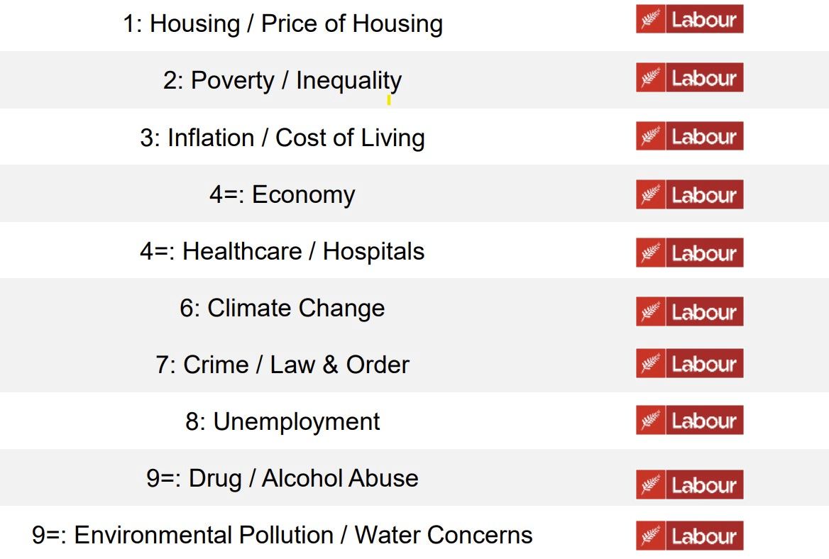 Rewind to the middle of 2021, not long after Jacinda Ardern’s Labour government was freshly reelected with a historic majority, amid an ongoing Covid crisis and a fractious opposition. Across those top 10 issues, the red wave couldn’t have been more clear.