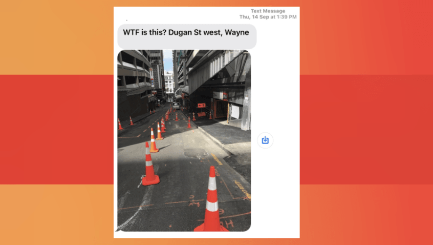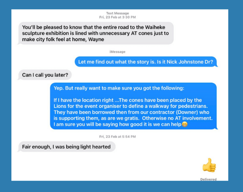 As it turns out, Brown has been trying to change the conescape from the inside, one cone at a time. Texts provided under the Local Government Official Information Act show Brown repeatedly haranguing the city’s top transport official, sending Kimpton screeds of cone complaints and miscellaneous traffic management gripes in the 14 months since his appointment as AT’s chief executive.