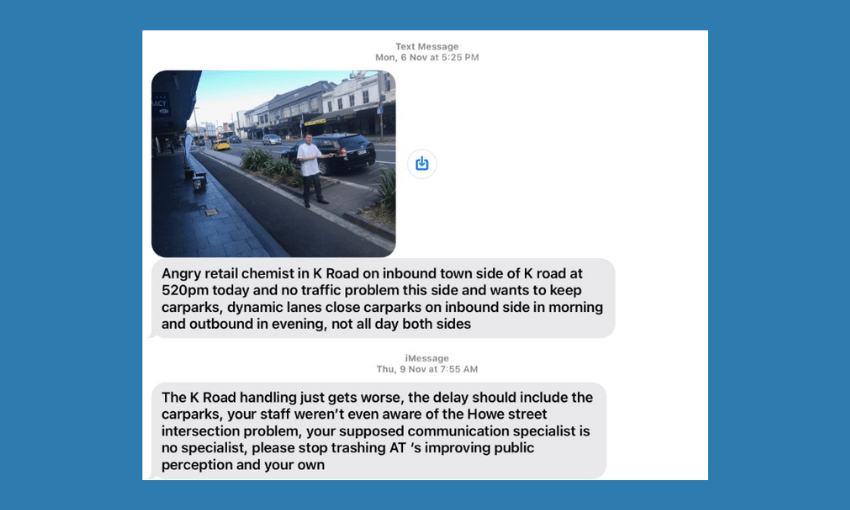 These complaints are interspersed with feedback on AT’s plans and projects, often in more frank terms than what’s reported in the media. Brown cut a comparatively diplomatic figure in his public comments on AT removing car parks to make room for a bus priority lane on Karangahape Rd in November, telling RNZ its officials “got a bit ahead of themselves”. His feelings were slightly less opaque in text messages to Kimpton, which urged the chief executive to keep the carparks and “please stop trashing AT’s improving public perception and your own”.
