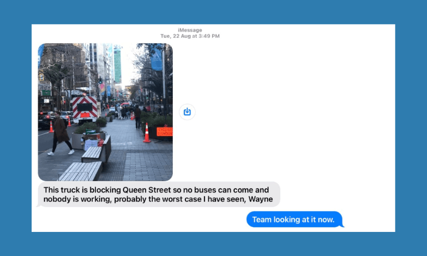 The teams investigated, the officials reported back, but the texts kept coming. Brown has furnished Kimpton with the details of almost every traffic management foible he’s encountered. Most of the aggravations are in the city centre, where Brown works, or the fringe suburbs near where he lives. “This truck is blocking Queen Street so no buses can come and nobody is working, probably the worst case I have seen, Wayne,” he sent, along with a picture, in August.