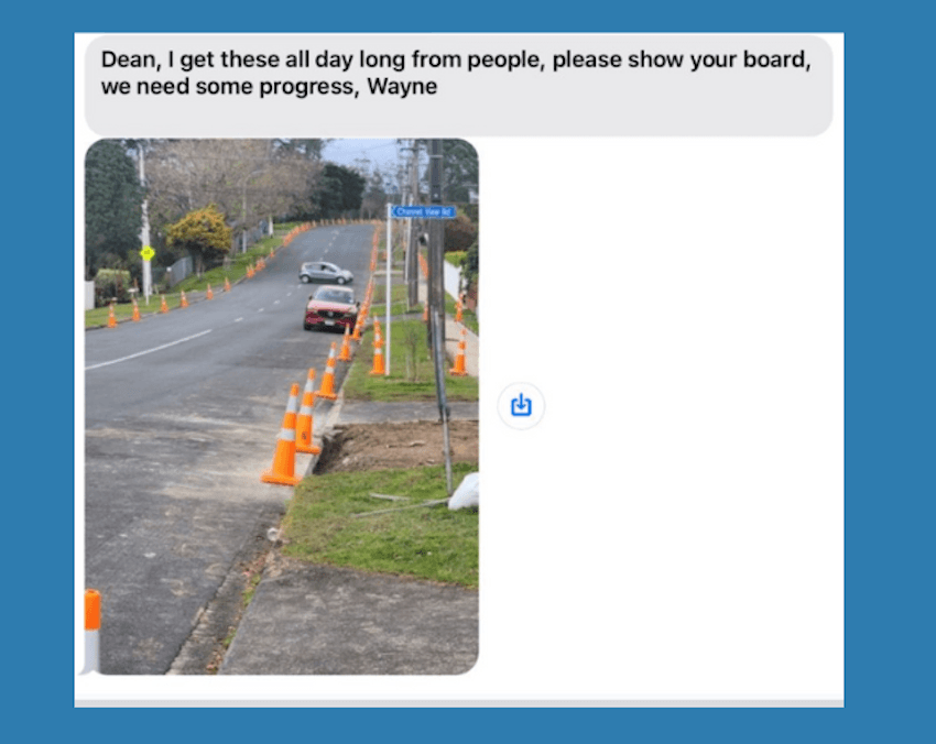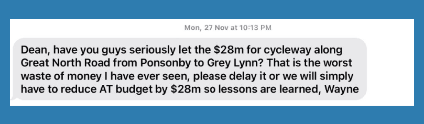 Another text takes an overtly threatening tone. Brown calls a $28m cycleway on Great North Road the “worst waste of money I have ever seen” and promises to reduce AT’s budget by an equivalent amount if Kimpton doesn’t delay the project. The upgrade was approved by AT’s board in June 2023, has a benefit-cost ratio of 2.4, and has been supported by a majority of councillors, who are unlikely to reduce AT’s budget for acting in line with their own decisions.