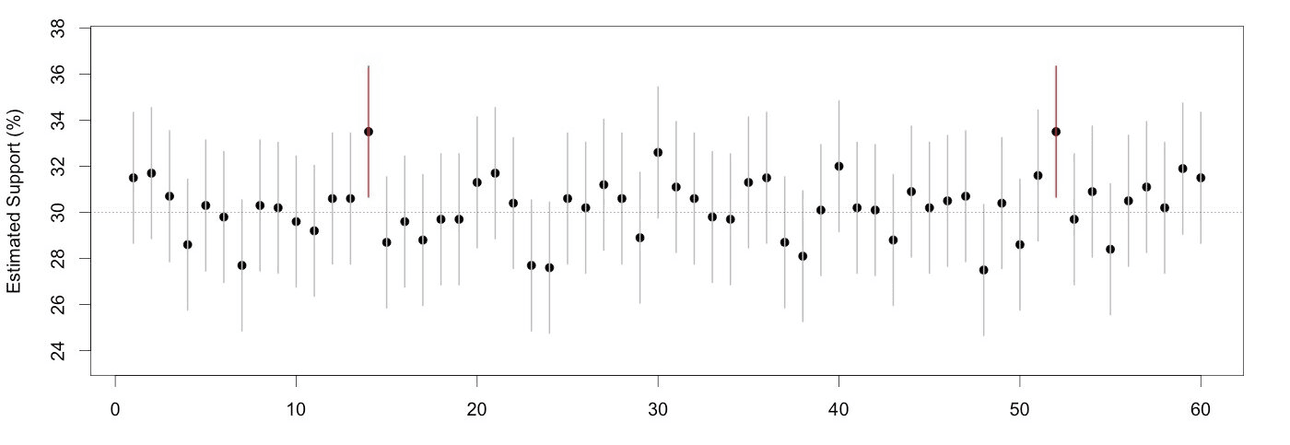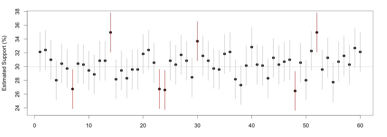 In a mathematically perfect world, given a very large number of opinion polls each sampling 1000 people, 19 out of 20 will get within 3% of the true support for a major party, and one out of 20 won’t, with the one out of 20 typically being off by just a little more than 3%. Here’s a picture of 60 computer-simulated polls of a party with 30% true support. Each line is a poll, with the dot being the headline support estimate and the line being the uncertainty interval. The line is grey if the poll was within 3% of the truth, and red if it wasn’t.