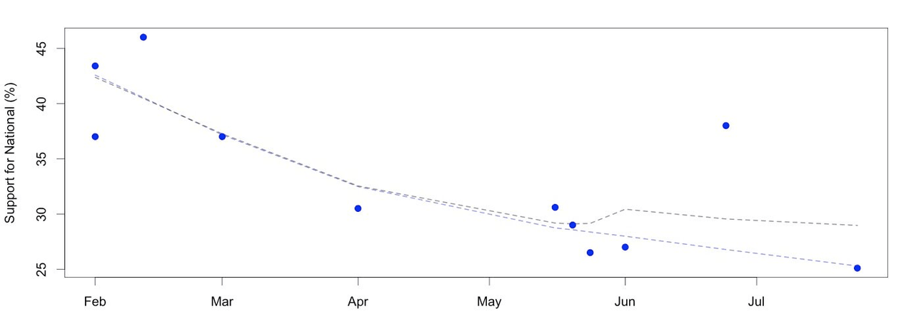Statistically, the 38% in late June looks like the outlier, and the rest of the points fit a smooth curve. That’s not the only possibility. It’s conceivable that support for National really shot up by 10 percentage points and then back down again, though such a dramatic change doesn’t seem likely. It’s also possible that the new poll is the outlier and that support for National is up to nearly 40%, or that both polls are ‘rogue’ and the truth is in the middle. It will be easier to be sure when we have results from another poll, which should happen soon.