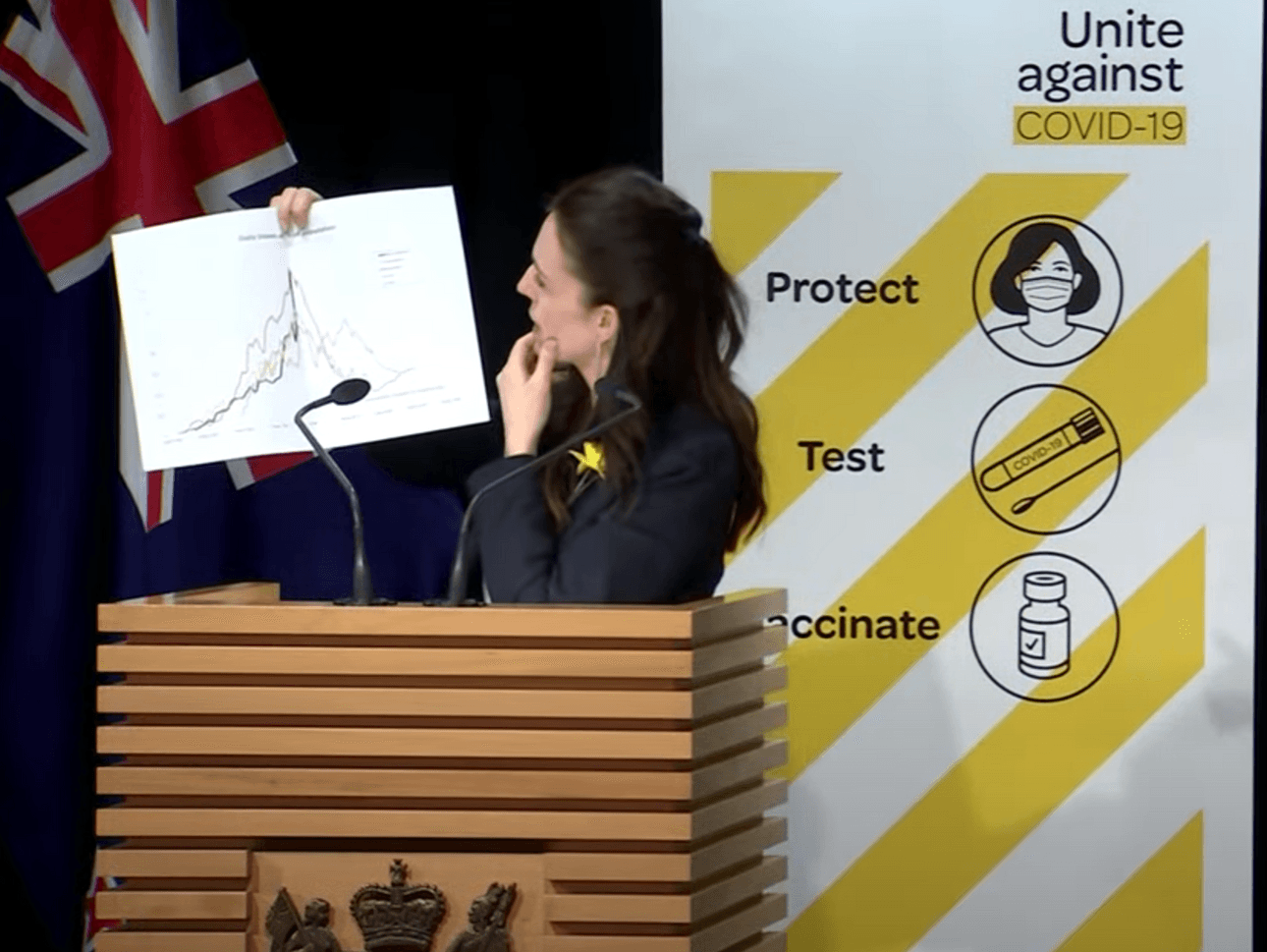 Holding up another one of her famous print-offs, PM Ardern said latest vaccination data showed that, per capita, New Zealand was "skyrocketing" toward the heights reached by some of the biggest nations.
