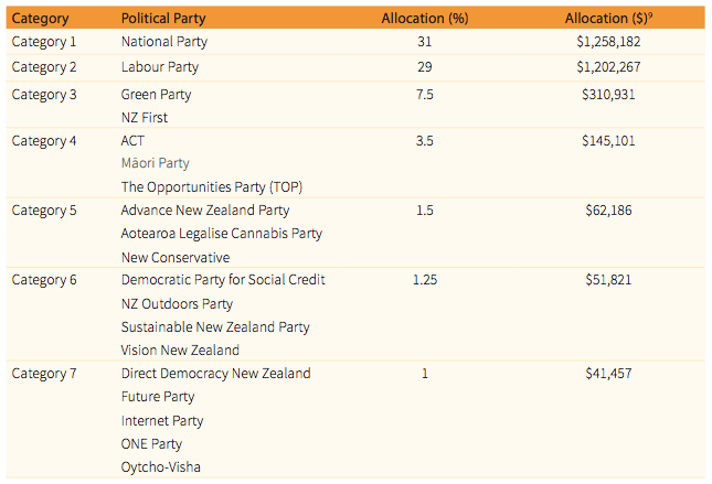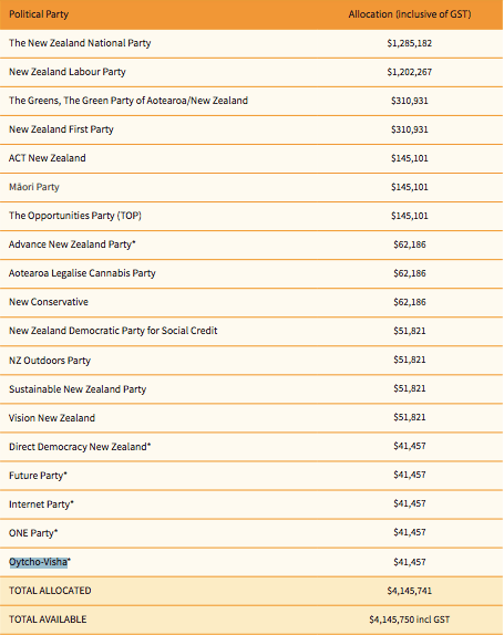 The pot of money for political parties to spend on election advertising on radio, television and the internet has been divvied up for 2020, with Labour and National securing more than a million dollars each out of an overall pool of just over $4 million.