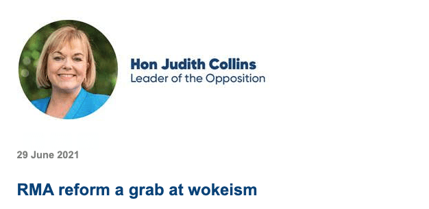 Now, in a press release, Collins has inexplicably labelled the government’s planned RMA overhaul a “grab at wokeism”.