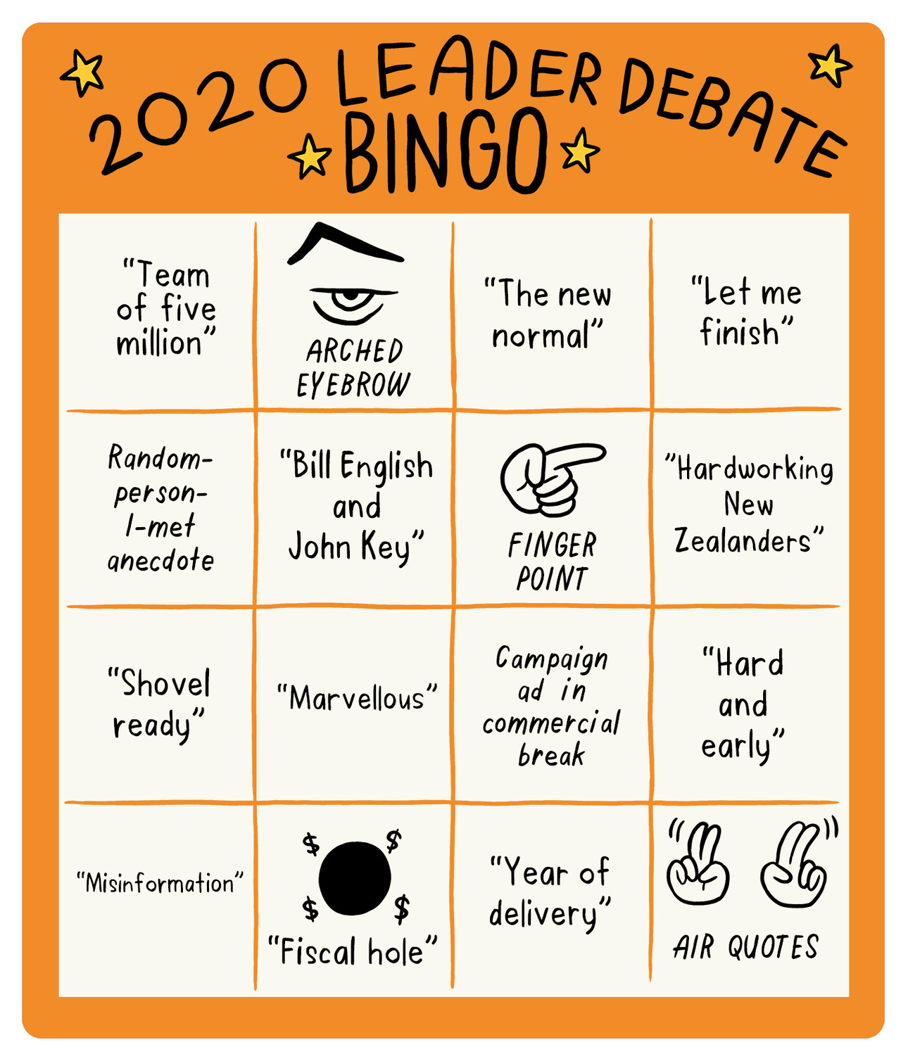 If you’re tuning into Newshub’s leaders’ debate that’s happening right now, don’t forget you can turn your watching experience into a fun game with our handy bingo card, designed by the one and only Toby Morris. If you’re some form of weeknight hedonist, you may wish to turn it into a drinking game.