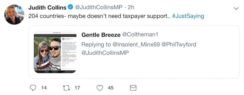 The picture attracted the attention of one Judith Collins, who, displaying a searing lapse in reading comprehension, retweeted a screengrab of the image (without obscuring the young couple’s personal details) with the quote “204 countries – maybe doesn’t need taxpayer support.. #justsaying.”