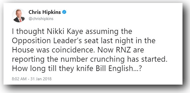 For all that they almost invariably rely on unnamed sources, reports such as this tend to snowball, become self-fulfilling prophecies even. “Speculation mounts over Bill English’s National leadership,” ran the item this morning on RNZ’s Morning Report. “Battle to replace Bill English: It’s all on”, went Newshub’s headline. And from Stuff: “National knives are out over election loss.”