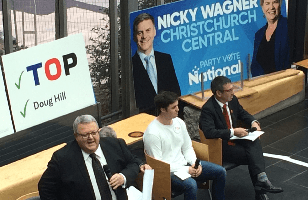 Given the updates to her Facebook, it looks like she was “busy” with her associate Conservation portfolio, going for a tramp on Banks Peninsula. Maybe the National Party got the invite, quickly arranged this important meeting with some trees, and then found a replacement. Who knows. What we do know is that by putting Brownlee into the mix, they successfully avoided any potential “rather be out on the harbour” stuff-ups, and starved Labour’s Duncan Webb of oxygen he might have got if he and Wagner had been in the same room going head-to-head. Sitting between Brownlee and Webb are the Green Party candidate Peter Richardson, and The Opportunities Party’s Douglas Hill.