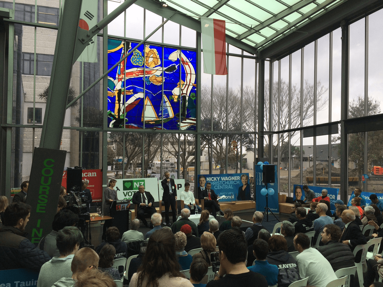 The surprise guest is Gerry Brownlee – who has stepped in to cover for the sitting Christchurch Central MP, Minister Nicky Wagner. It’s a strange situation: at the last election, the Labour candidate for Ilam (checks notes) James Dann complained that Brownlee wasn’t showing up to meet the candidate events in the electorate. One of the questions from the floor asks him just that – why is he here, in another electorate, when just last week he declined to appear at an event in the seat he’s running for? There are two possible explanations. The first is that Wagner – who is a minister, so theoretically quite busy – was at another engagement and simply couldn’t make it. The second, more cynical interpretation, is that National were worried about how she would perform in such a debate, and so they hooked her.